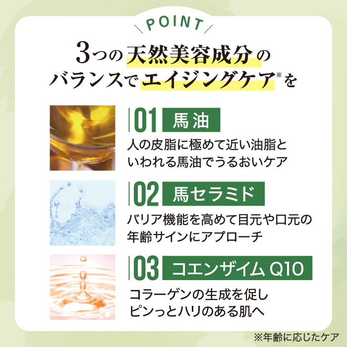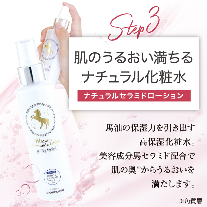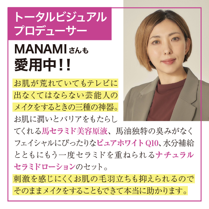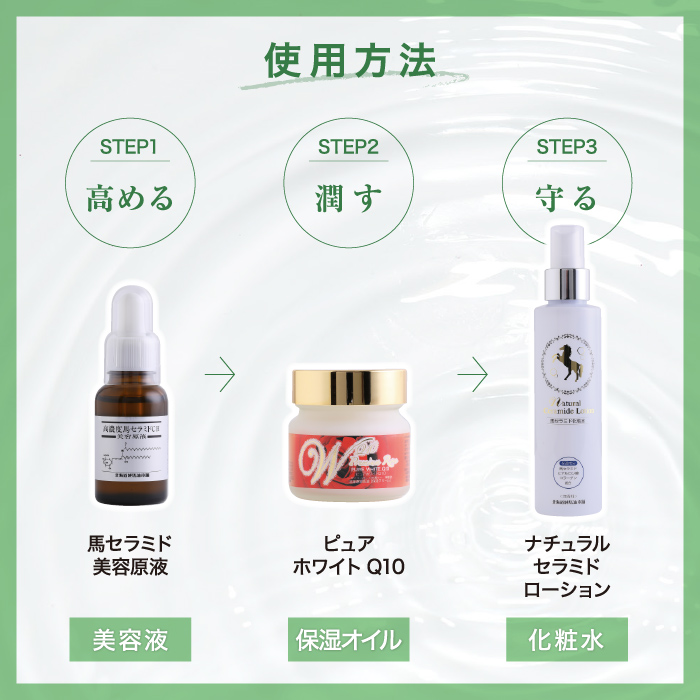 使用方法:洗顔後、馬セラミド美容原液を半スポイト~1スポイト手にとりお顔全体になじませます。目元や口元など年齢線や、乾燥の気になる部分には重ね付けをしてください。その後、ピュアホワイトQ10をパール大(目安)手にとりお顔全体になじませます。最後にナチュラルセラミドローションを6~8プッシュ(目安)スプレーしなじませます。乳液やクリームは不要です。
