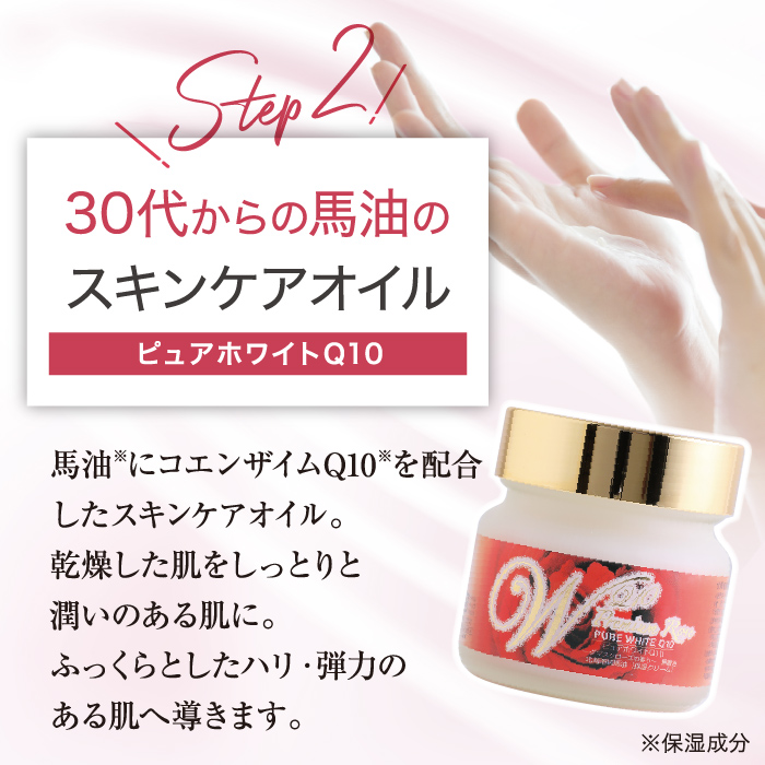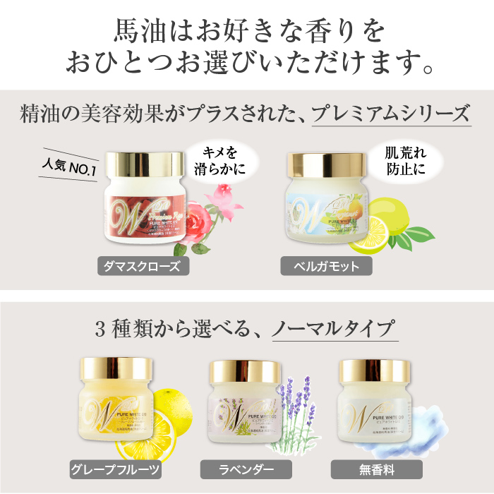 ピュアホワイトQ10:馬油、部分水添馬油、ユビキノン、スクワラン、酢酸トコフェロール、(ベルガモット果実油、ダマスクバラ花油、ラベンダー油、グレープフルーツ果皮油)