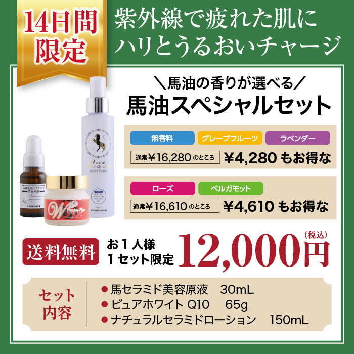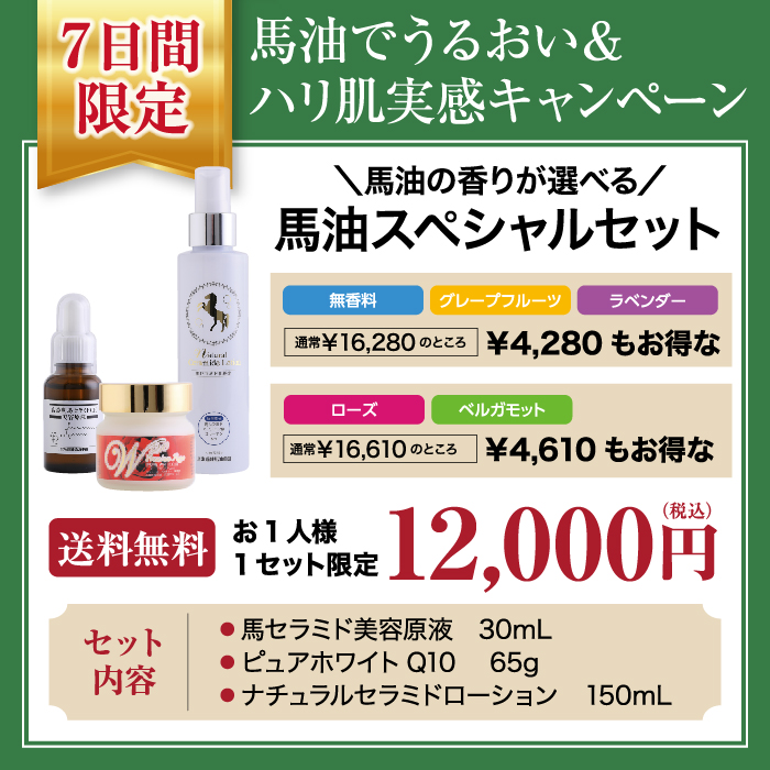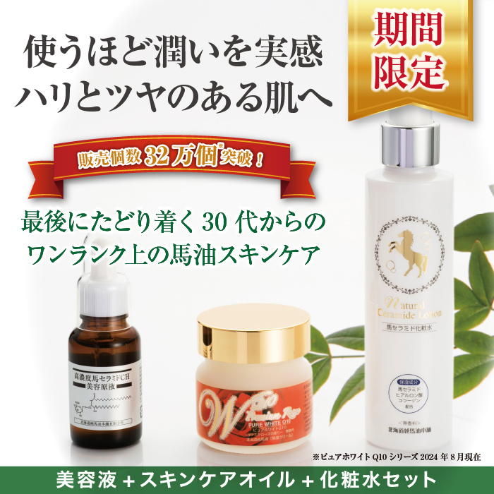 内容量:馬セラミド美容原液:30mL、ピュアホワイトQ10:65g、ナチュラルセラミドローション:150mL