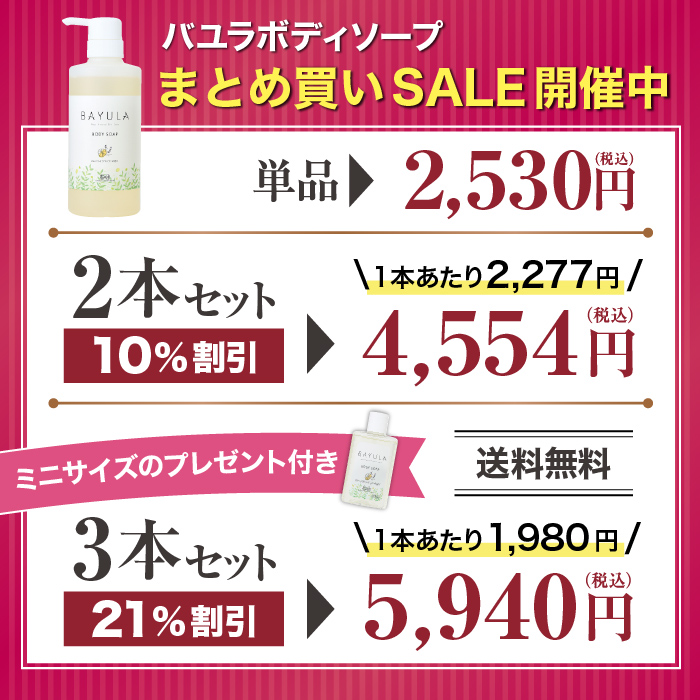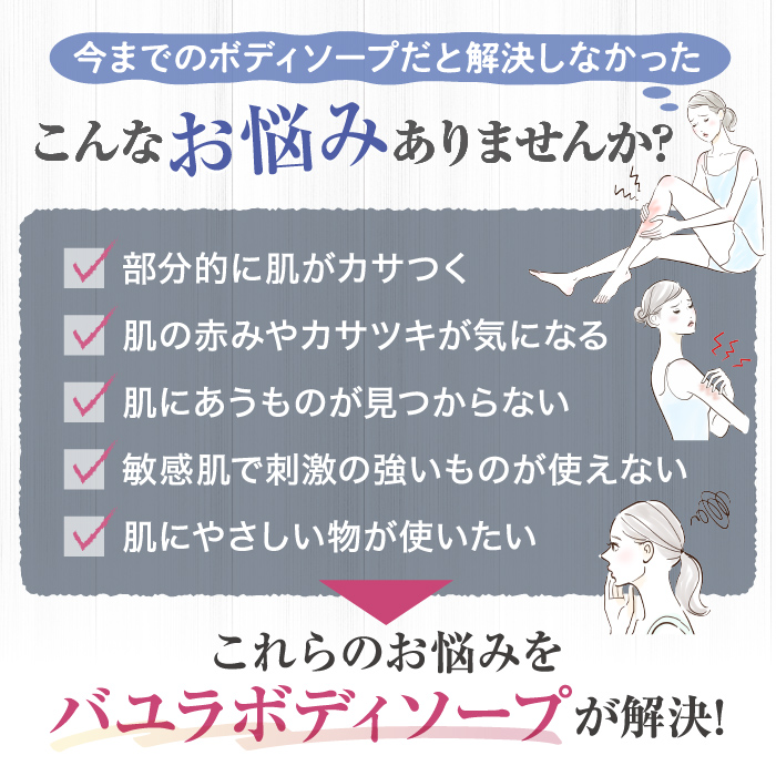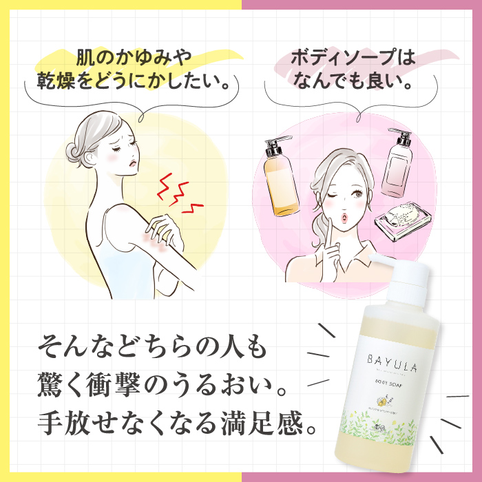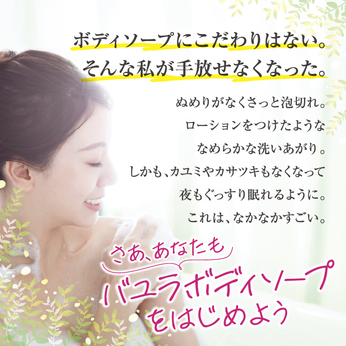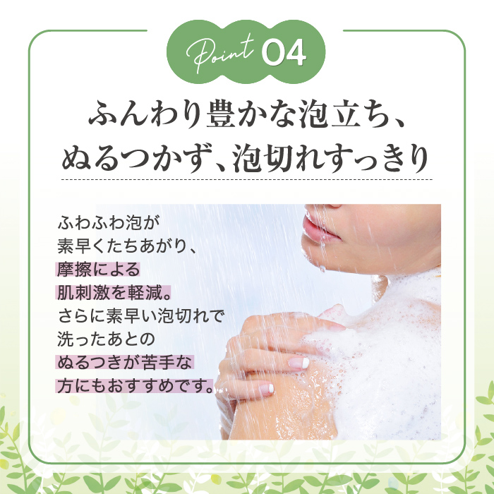 使用方法:お湯を含ませたボディタオルやスポンジに、ボディソープを2プッシュとり泡立てます。摩擦に気を付けながらやさしく洗った後、十分に泡を洗い流してください。