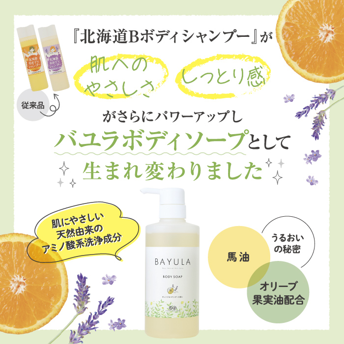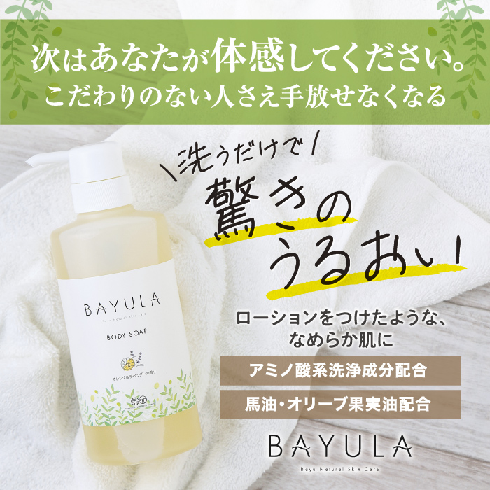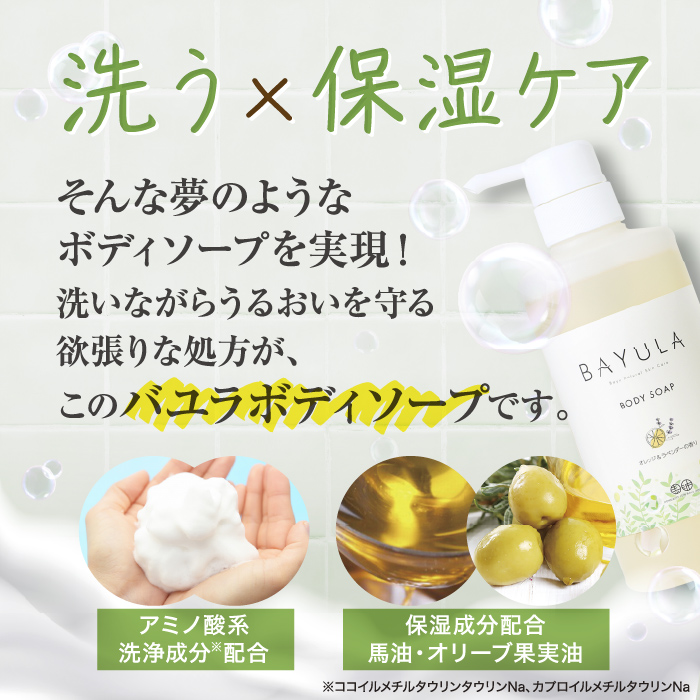 全成分:水、ヤシ脂肪酸K、ラウリルベタイン、ココイルメチルタウリンタウリンNa、カプロイルメチルタウリンNa、馬油、オリーブ果実油、グリセリン、PEG-60水添ヒマシ油、フェノキシエタノール、オレンジ油、ラベンダー油