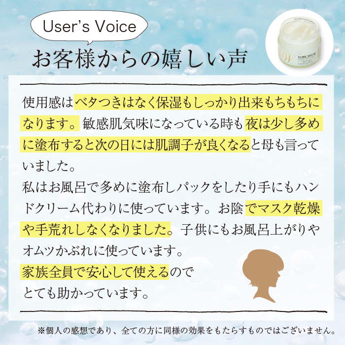 お風呂あがりにピュアホワイトを使うことで、お肌がだんだん柔らかくなり、ツルツルになったとのご感想を伺うことができ、製品がしっかりとお役に立てているようで大変嬉しく思っております。